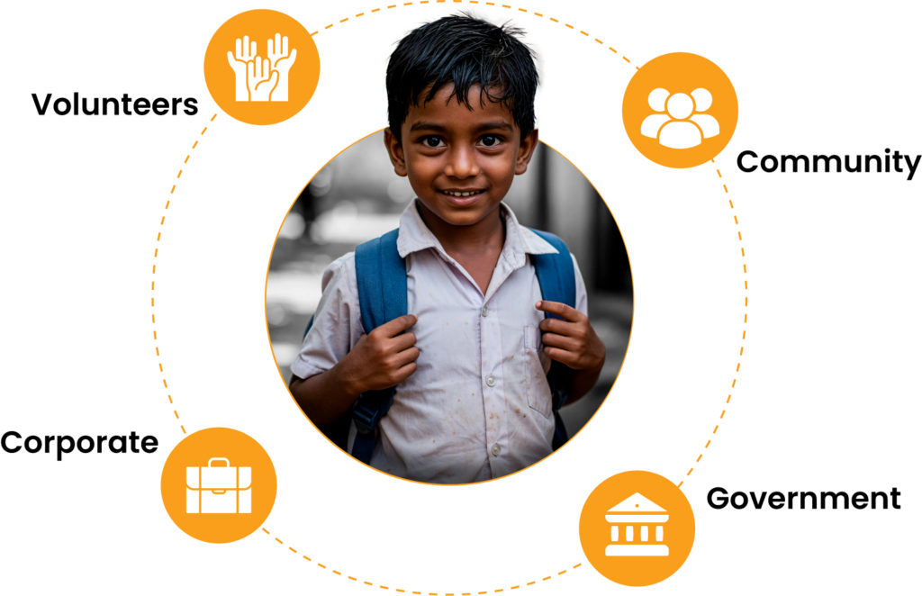 With your support, we address the real needs of underprivileged children by working hand-in-hand with government bodies, corporate partners, dedicated volunteers, and the community.